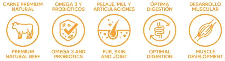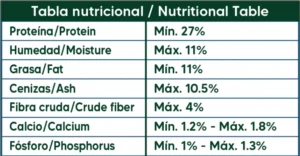 Harina de carne bovina premium, Concentrado proteico de maíz, Torta de soya, Maíz, Grasa animal (grasa de pollo), Aceite de trucha, Extracto de levadura natural, Sal, Carbonato de calcio, Premezcla de vitaminas y minerales quelatados: Vitamina A, Vitamina D3, Vitamina E (tocoferol), Vitamina K, Vitamina B1, Vitamina B2, Vitamina B6, Vitamina B12, Niacina, Ácido pantoténico, Biotina, Ácido fólico, Zinc, Cobre, Hierro, Manganeso, Selenio, Yodo, Extracto de saponinas, Antifúngico, Fibra natural de lignocelulosa, Extracto de toronjil, Magnesio.